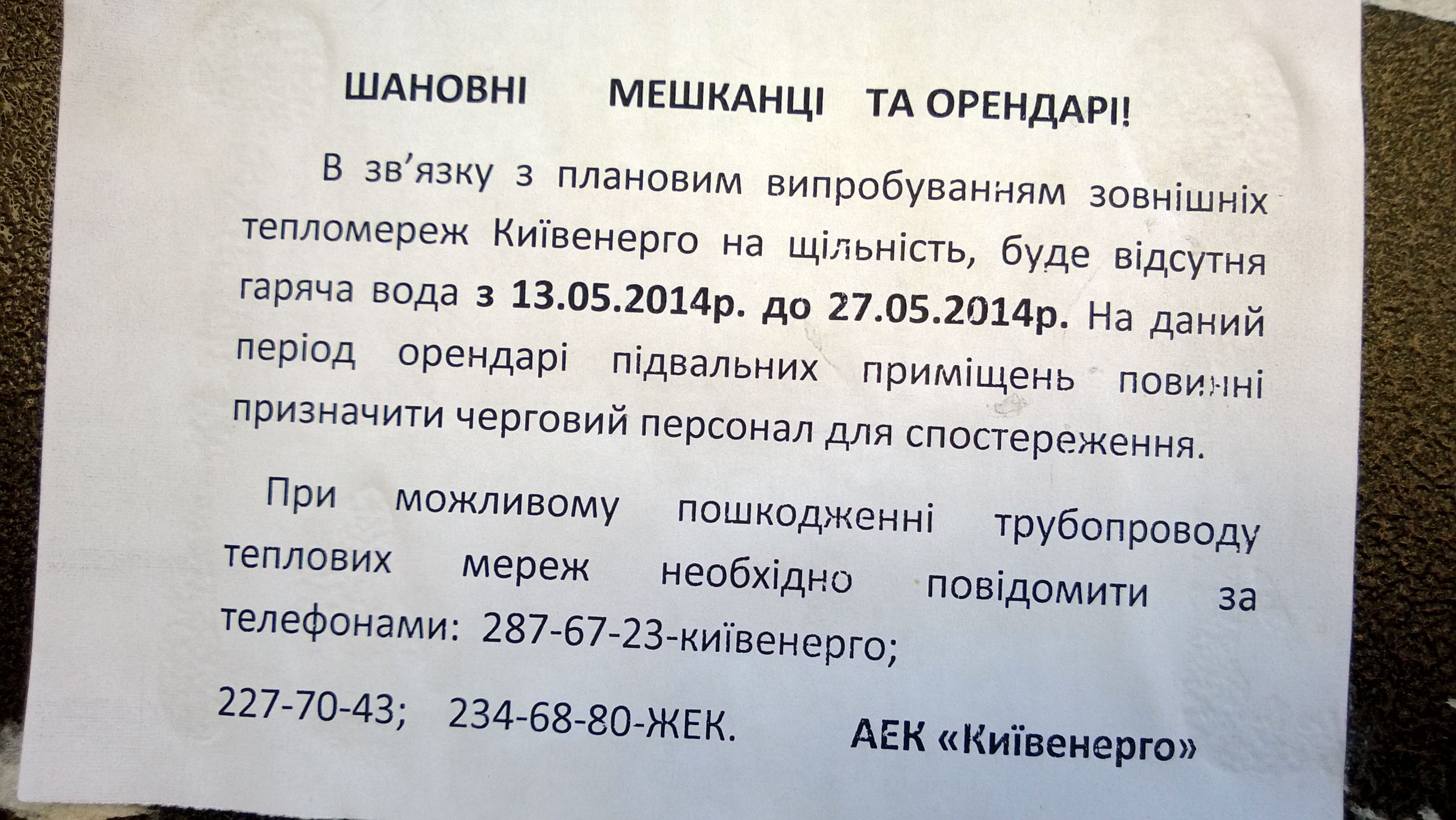 Là, il est écrit que nous n’aurons pas d’eau chaude à partir de demain et pendant 2 semaines. Je m’en réjouis déjà ! (je sais, ma maîtrise de l’ukrainien vous épate)